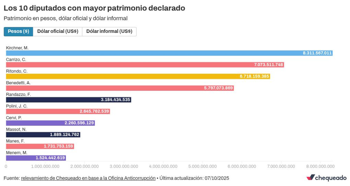 Máximo Kirchner (Fuerza Patria), Carla Carrizo (Democracia para Siempre) y Cristian Ritondo (PRO) son los 3 diputados nacionales que más patrimonio declararon, de acuerdo con un relevamiento de Chequeado sobre los 257 legisladores que ocupan una banca en la Cámara baja. Entre los primeros 10 del ranking figura el presidente del cuerpo, Martín Menem (La Libertad Avanza), según los reportes presentados ante la Oficina Anticorrupción (OA), consignó un informe del portal Chequeado.
