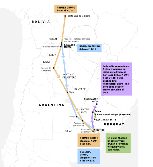 El primer grupo lo hizo en un ómnibus de la empresa Autobuses Quirquincho SRL que partió de Santa Cruz de la Sierra, Bolivia, el 13/11, con destino a la Terminal de Ómnibus de Retiro, en Buenos Aires. En el camino, ya al día siguiente, se detuvieron tres veces, donde la familia pudo haber tenido contacto también con lugareños del Parador Mosconi (Salta), donde los pasajeros podían almorzar, en el Parador Rosario de la Frontera (Santiago del Estero), donde pararon para cenar ese día. A la mañana siguiente, ya el sábado 15, el ómnibus hizo la última escala en el Parador San Nicolás (Buenos Aires) durante la mañana y antes de llegar, a las 12.30, a la terminal ubicada en el barrio porteño de Liniers.