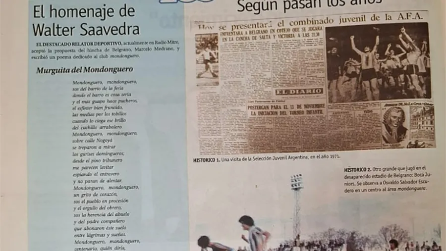 También dedicó letras al Club Belgrano con motivo de su aniversario 100. Y así lo publicó El Diario de Paraná el viernes 10 de junio de 2011. Su poesía se llama Murguita del Mondonguero. Y con su impronta literaria, por ejemplo, recordó el vacío que quedó en el club tras perder su cancha en los 90: “Mondonguero, Mondonguero, centenario quien diría, nos dejaron en la vía, pero nunca nos pudieron”.