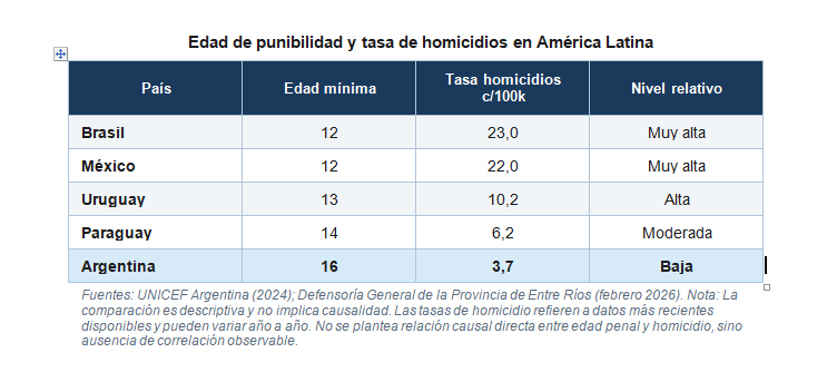 El análisis comparado permite observar que, en el contexto latinoamericano, no existe correlación entre menor edad de punibilidad y mejores indicadores de seguridad. La comparación es descriptiva y no implica causalidad: las tasas corresponden a contextos estructuralmente heterogéneos —con diferencias sustanciales en desigualdad, presencia del crimen organizado, capacidad estatal e historia institucional— y se presentan aquí con finalidad descriptiva y no como evidencia de determinación causal, aunque el patrón observado no resulta consistente con la hipótesis que sustenta la reforma.