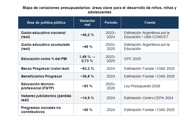 •             Las becas Progresar sufrieron una caída real estimada del 63,3 % en 2024, con reducción del 36,8 % de beneficiarios (estimaciones independientes de Fundar/CIAS, 2025; ver nota metodológica al pie del cuadro).