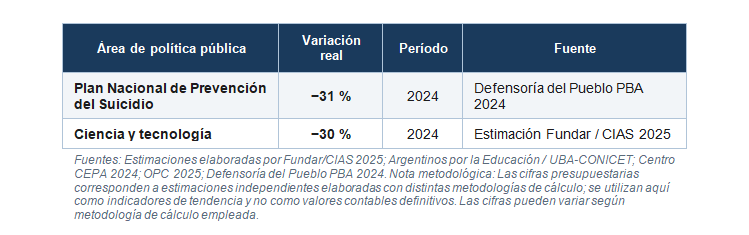 •             El presupuesto del Plan Nacional de Prevención del Suicidio —creado por ley en 2015— fue reducido un 31 % en 2024. Al mes de septiembre solo se había ejecutado el 68 % del presupuesto ya reducido.