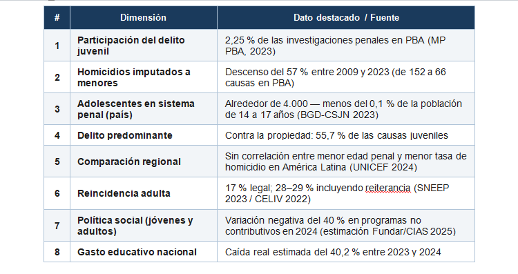 El patrón empírico observado es consistente: el delito juvenil es estadísticamente marginal y decreciente; la reducción de la edad de punibilidad no muestra correlación con mejoras en la seguridad en el contexto regional; el sistema penal presenta límites documentados como estrategia resocializadora; y los instrumentos probadamente más eficaces —la escuela, el deporte, la contención familiar y comunitaria, la salud mental— han sido objeto de reducciones presupuestarias sistemáticas en el mismo período en que se impulsa la reforma.