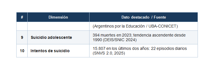 El suicidio adolescente mantiene niveles elevados, con un promedio cercano a un caso diario según registros nacionales recientes. Ese número es más del doble que el total de adolescentes acusados formalmente por delitos graves en todo el año en la Provincia de Buenos Aires. La crisis de salud mental juvenil es, estadísticamente, una emergencia de mayor magnitud que el delito juvenil —y no generó ninguna respuesta legislativa comparable.