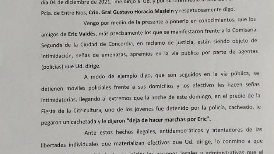 Los abogados de la familia de Eric Valdéz, Guillermo Peñalver y Carlos María Conti ingresaron este lunes por la mañana en la Jefatura de Policía de Concordia, un escrito poniendo en conocimiento a los jefes, comisario mayor Jorge Cancio y comisario general Gustavo Maslein de que personal a su cargo “amenaza” e “intimida” a amigos de Eric que se manifestaron en una marcha frente a la Comisaría Segunda reclamando justicia por la muerte del joven.