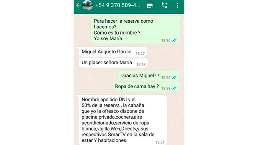 El locatario le pidió un anticipo del 50% y le ofreció comprarle las entradas para el carnaval. El día que iban a viajar, Miriam le mandó un mensaje al dueño de las cabañas y este le comunicó que debía transferir el otro 50% por la gran demanda que había. Esto último hizo sospechar a la turista, pero de todas formas realizó la transferencia.