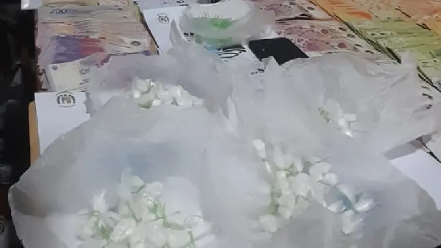 El parte policial indica que “en el domicilio allanado se procedió al secuestro de una importante cantidad de envoltorios conteniendo sustancia estupefaciente clorhidrato de cocaína preparada para su comercialización bajo la modalidad al menudeo, como así también de sustancia estupefaciente marihuana. Asimismo, en dicho domicilio se halló una considerable suma de dinero en efectivo, aparatos de telefonía celular, recortes de nylon coincidentes con los envoltorios y demás elementos de interés para la causa”.