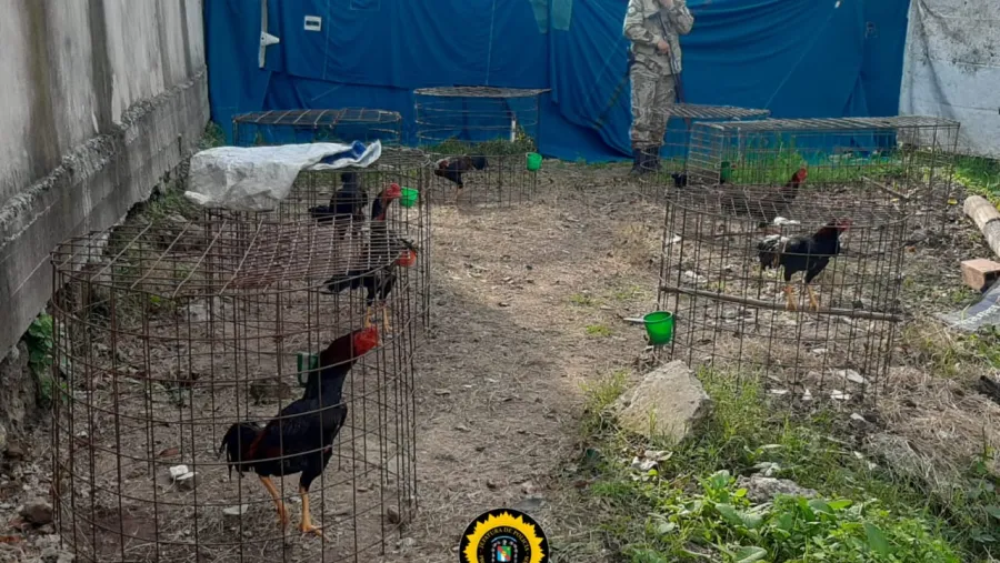 Los brigadistas llegaron a una vivienda y procedieron “al formal secuestros de (13) gallos de riña, (01) pista/ring de combate, jaulas, bolsas y cajones de transporte y elementos utilizados para el maltrato y para instar a las aves a pelear, tales como púas, espuelas, jeringas, cabezales”.