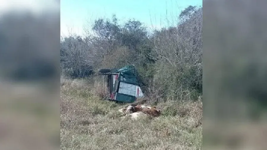 Al llegar al lugar encontraron al conductor, un hombre de 46 años domiciliado en Federal, y a su hijo de 13 años, afortunadamente sin lesiones. El hombre refirió que, mientras viajaban en dirección Sur - Norte en su camioneta Toyota Hilux, con tráiler habilitado por Senasa para el transporte de animales, con cuatro vacas y un toro de raza Braford, se cortó la lanza del tráiler. A causa de esto se produjo el despiste y vuelco que provocó la muerte de los vacunos. Los animales quedaron en la banquina junto al remolque.