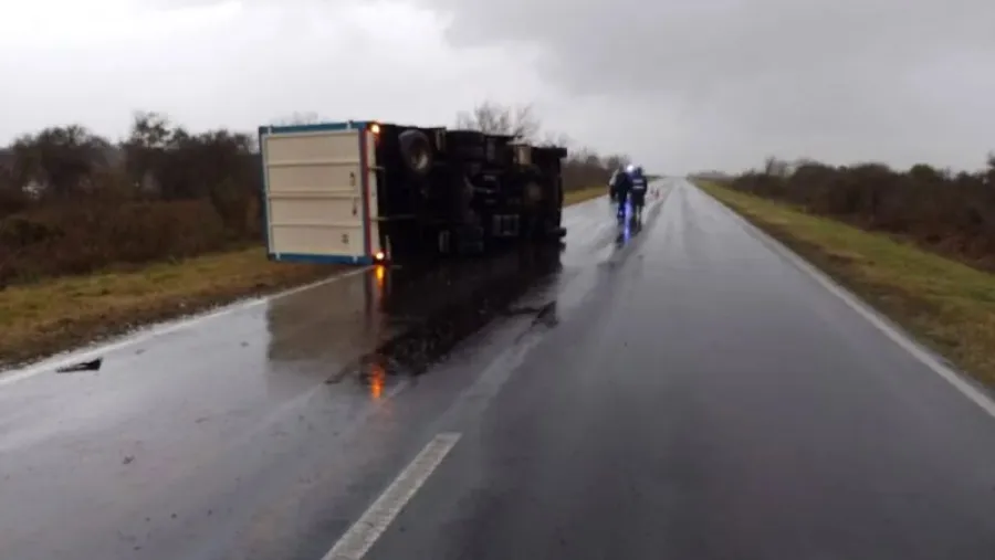 En medio de las intensas lluvias, volcó un camión este martes en la ruta 32. Se trata de un Mercedes Benz que perdió el control y volcó en el acceso a Estación Sosa, en el kilómetro 51.