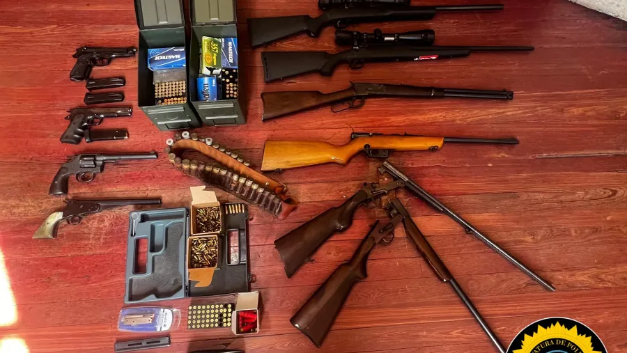 En la vivienda se halló un verdadero arsenal: una pistola Pietro Beretta Brigadier 92 calibre 9 mm con dos cargadores, una pistola Colt calibre .45, varias carabinas de distinto calibre con miras telescópicas, una escopeta calibre .36, un pistolón calibre .45, un revólver Colt sin percutor, además de cinco cargadores para calibre .22 y dos cajas de municiones calibre .50 con proyectiles de distintos tipos.