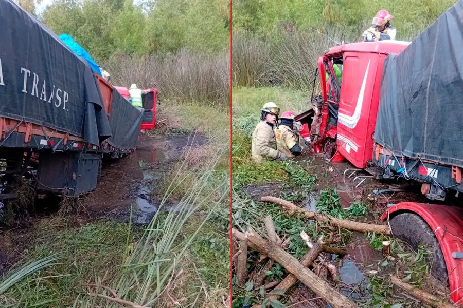 De acuerdo al informe de los Bomberos Voluntarios de Ceibas, uno de los camiones terminó sumergido en una zona de bañados, luego de chocar contra un poste del tendido eléctrico de alta tensión, lo que dejó cables sobre el rodado y generó una situación de alto riesgo.