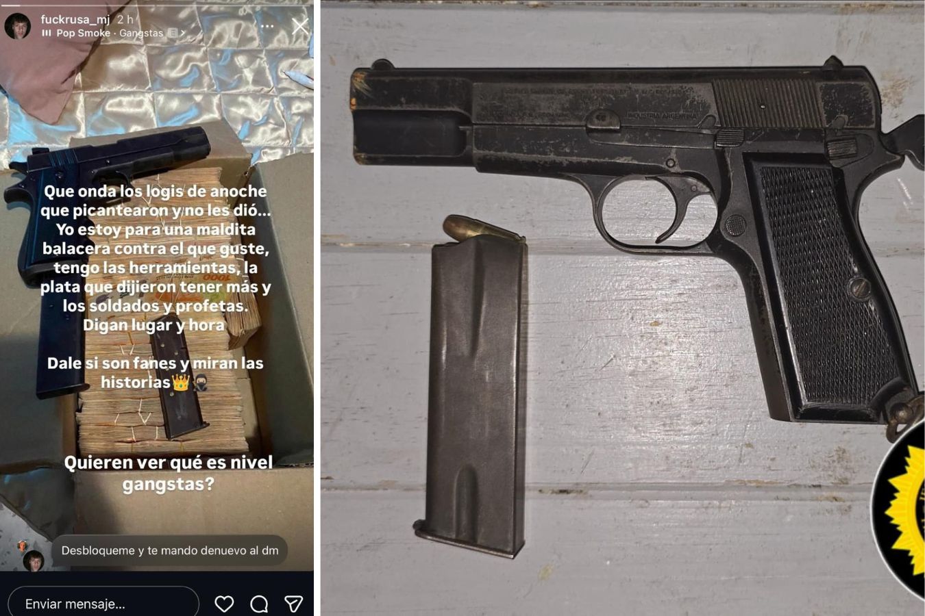 Según la captura de pantalla que circuló entre vecinos de Cerrito y conocidos del acusado, Lautaro había publicado una foto en su estado de Whatsapp bastante tiempo antes: “Qué onda los logis de anoche que picantearon y no les dio… Yo estoy para una maldita balacera contra el que le guste, tengo las herramientas, la plata que dijeron tener más y los soldados y profetas. Digan lugar y hora. Dale si son fanes y miran las historias. Quieren ver qué es nivel gangstas?”, se lee en el texto que se le adjudica al joven. En la imagen aparece una caja llena de billetes, con una pistola arriba y dos cargadores, sobre una cama con un acolchado blanco brilloso. El arma de fuego no es la misma que incautó la Policía en el procedimiento, sino que se trata de una calibre 11.25.