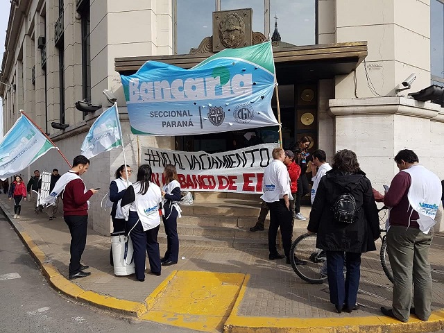 Empleados nucleados en La Bancaria, protestaron por falta de personal en la sede central del Banco de Entre Ríos, en Paraná. “Es un desquicio, las autoridades del banco no quieren ver la realidad. Hoy el sector de subsuelo de calle Monte Caseros no atendió al público por falta de personal. Entonces se atendió a todos los clientes en el sector principal. Esa situación decantó en una extensa fila de personas y demoras de más de dos horas para atender a los clientes”, contó Augusto Gervasoni, dirigente gremial de La Bancaria a ANÁLISIS.