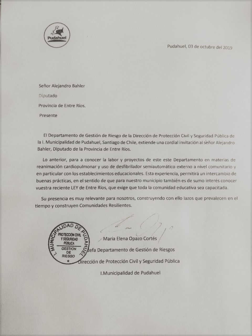 Tras la aprobación a fines de septiembre de la ley que establece como obligatorias a las prácticas de RCP en las escuelas de toda la provincia, el autor de la iniciativa, el diputado Alejandro Bahler, recibió una invitación desde Chile con el objetivo de dar a conocer en el vecino país más sobre el texto. La misiva fue enviada por el Departamento de Gestión de Riesgo de la Dirección de Protección Civil y Seguridad Pública de Pudahuel. En Santiago, además, será recibido por el embajador argentino en Chile, José Octavio Bordón.