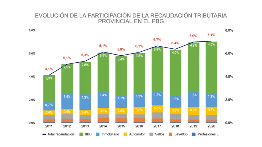 “Dos de cada tres pesos de la recaudación provincial provienen del Impuesto a los Ingresos Brutos (IIBB), que representa el 4,5% del PBG y explica la mayor parte del incremento de la presión fiscal. Hace una década la provincia recaudaba un 2,3% del PBG por Ingresos Brutos. No es casualidad que el crecimiento de la presión tributaria haya sido motorizado por este impuesto, ya que es el más fácil de incrementar y recaudar. En primer lugar, porque lo pagan emprendedores y empresas de la provincia, que son una minoría, a diferencia de otros tributos que recaen sobre un conjunto más amplio de los ciudadanos, como los impuestos inmobiliario y automotor. El efecto final de Ingresos Brutos, sin embargo, afecta a todos los ciudadanos, ya que el incremento se traslada a los precios”, se agregó.