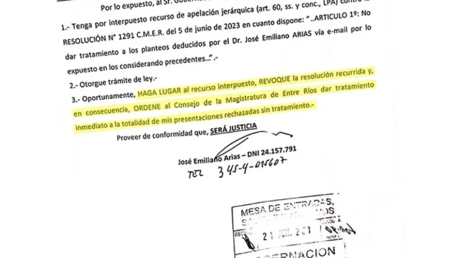 Arias pide que esa decisión sea revocada y, en consecuencia, el gobernador ordene al Consejo de la Magistratura de Entre Ríos “dar tratamiento inmediato al planteo de Remoción del Presidente del CMER”.