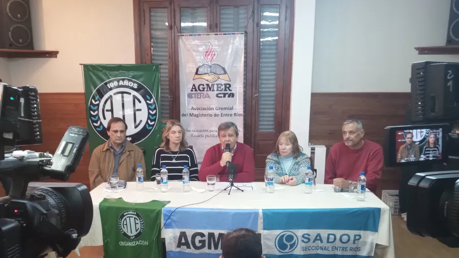 El anuncio se hizo en una rueda de prensa que se llevó a cabo este martes en la sede de la Asociación Gremial del Magisterio de Entre Ríos (Agmer), encabezada por su secretario general, Marcelo Pagani, y de la que participaron el titular de la Asociación del Magisterio de Enseñanza Técnica (Amet), Andrés Besel; la titular del Sindicato Argentino de Docentes Particulares (Sadop), Alejandra Frank; la referente de la Unión Docentes Argentinos (UDA), Mirta Raya, y el titular de la Asociación Trabajadores del Estado (ATE), Oscar Muntes, publicó Entre Ríos Ahora.