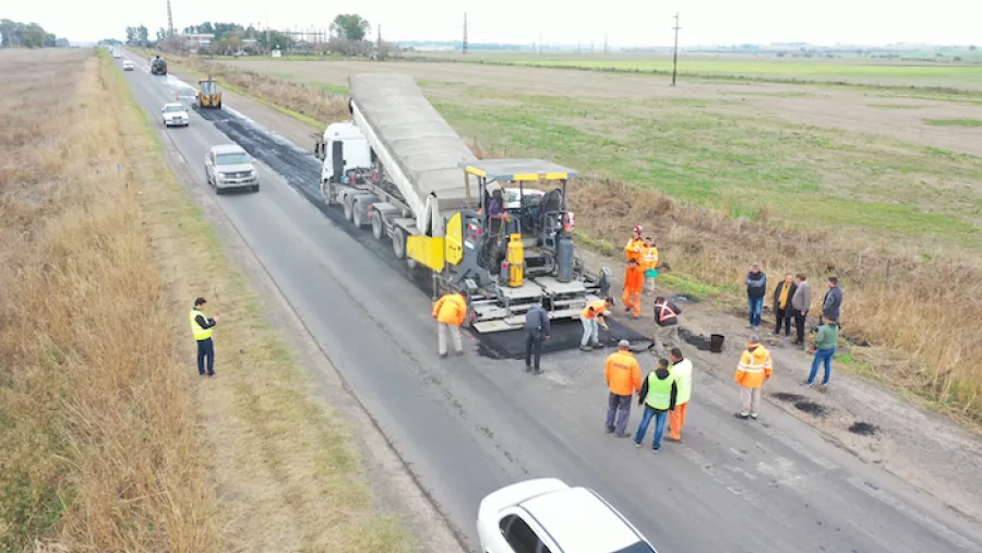 Una obra reactivada: en la ruta 32 ya comenzó la colocación de la capa asfáltica.