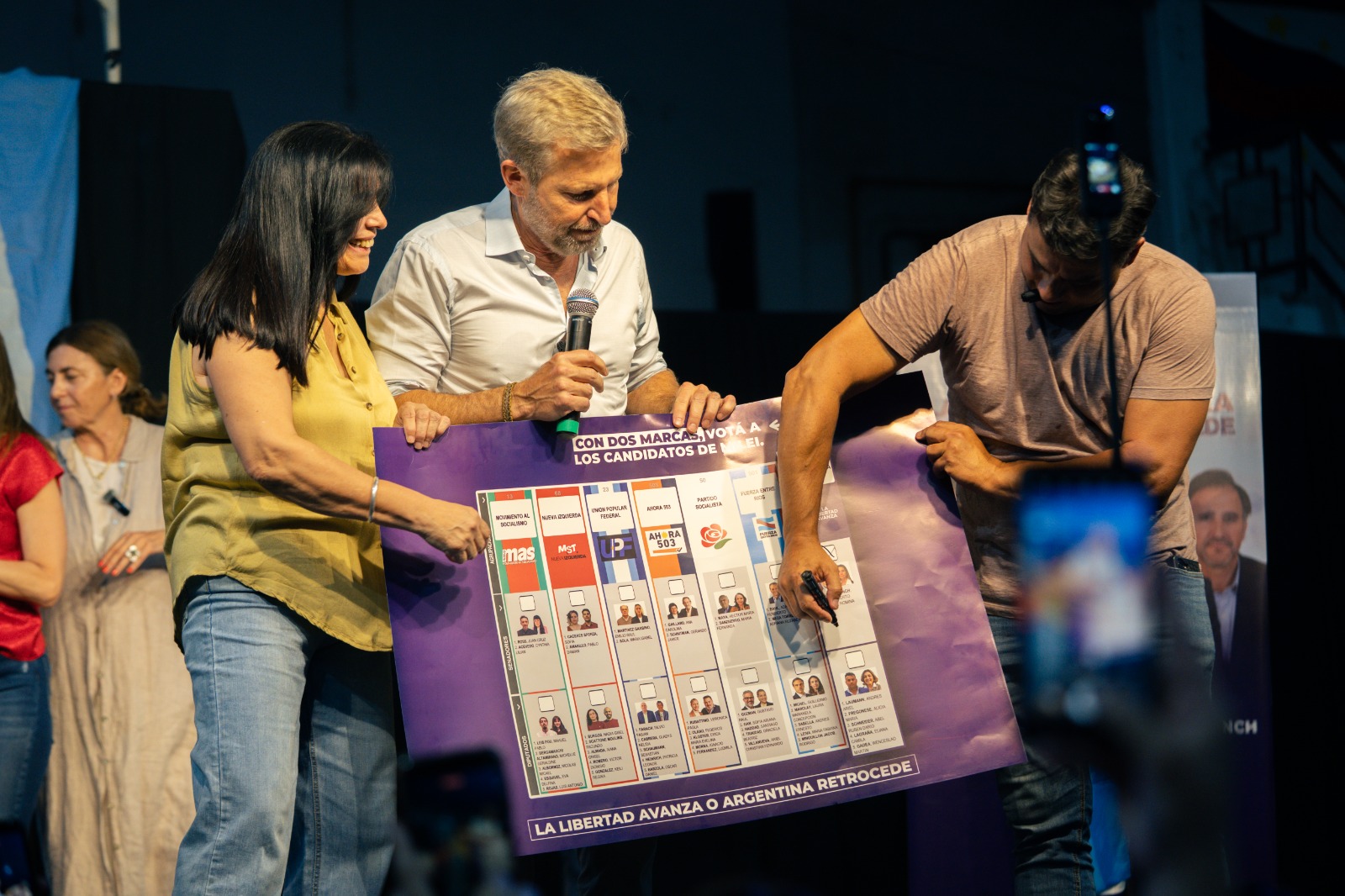 Los candidatos de la ALLA Entre Ríos se mostraron en el escenario vivando a la multitud: Romina Almeida, candidata a senadora y Andrés Laumann, Alicia Fregonese, Darío Schneider y Wenceslao Gadea, candidatos a diputados nacionales. Por su parte, Joaquín Benegas Lynch, candidato a senador nacional, estaba en Rosario, a pedido del presidente Milei; quien quiso que lo acompañara en el acto de cierre nacional, como hombre de confianza y representante de los entrerrianos.