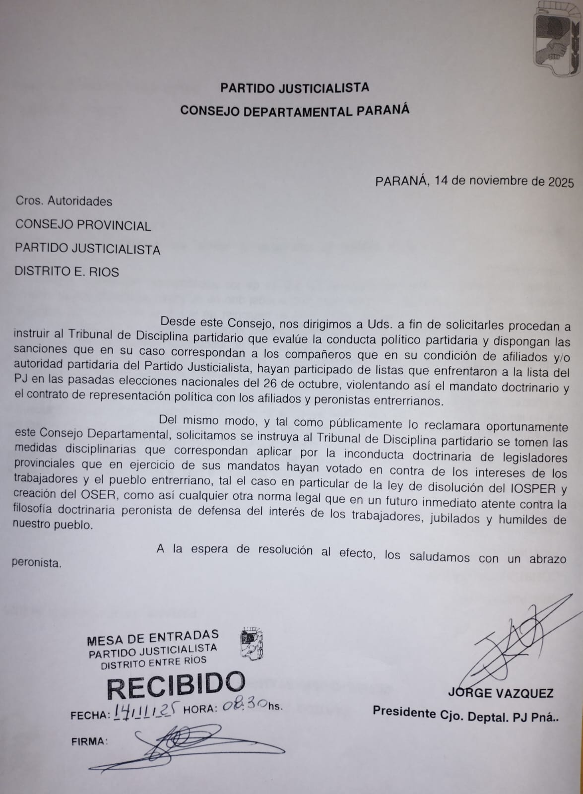 El presidente del PJ de Paraná, Jorge Vázquez, solicitó formalmente al Consejo Provincial la intervención del tribunal de disciplina y la aplicación de sanciones a los dirigentes que participaron en las elecciones con otros sellos partidarios. También solicitó que se tomen medidas contra los legisladores que votaron distinto a sus bloques.