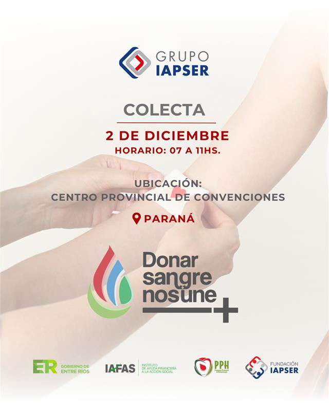 El Instituto Autárquico Provincial del Seguro de Entre Ríos (Iapser) realizará una “colecta de sangre interna”. Será este martes, desde las 8.15, en el Cetro Provincial de Convenciones (CPC).