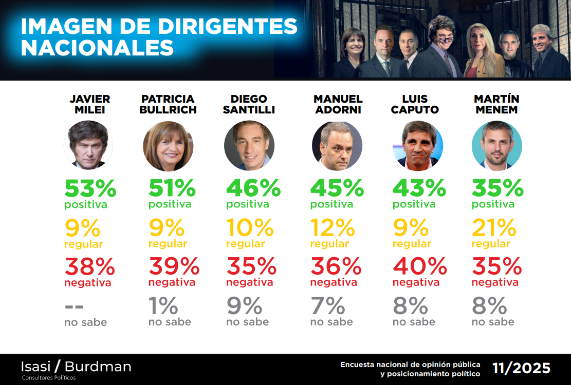 -Patricia Bullrich (ministra de Seguridad y senadora nacional electa por LLA): 51% positiva, 9% regular, 39% negativa, 1% no sabe.