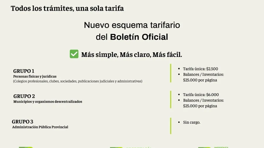 La modificación introduce un esquema más claro y transparente, basado en el concepto "Todos los trámites, una sola tarifa", que reduce la cantidad de ítems y facilita tanto la comprensión de la información como la estimación de los costos por parte de los usuarios. Este cambio de estructura del cuadro tarifario adecua el sistema al formato virtual del Boletín Oficial al dejar atrás la lógica de publicación en papel, vigente durante más de 100 años. De este modo, la tarifa pasa a vincularse con el trabajo de procesamiento de la información y no con la extensión del texto.