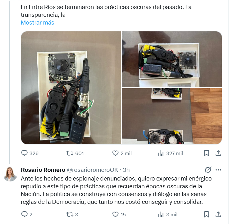 A través de su cuenta de Twitter, Romero manifestó: “Ante los hechos de espionaje denunciados, quiero expresar mi enérgico repudio a este tipo de prácticas que recuerdan épocas oscuras de la Nación. La politica se construye con consensos y diálogo en las sanas reglas de la Democracia, que tanto nos costó conseguir y consolidar”.