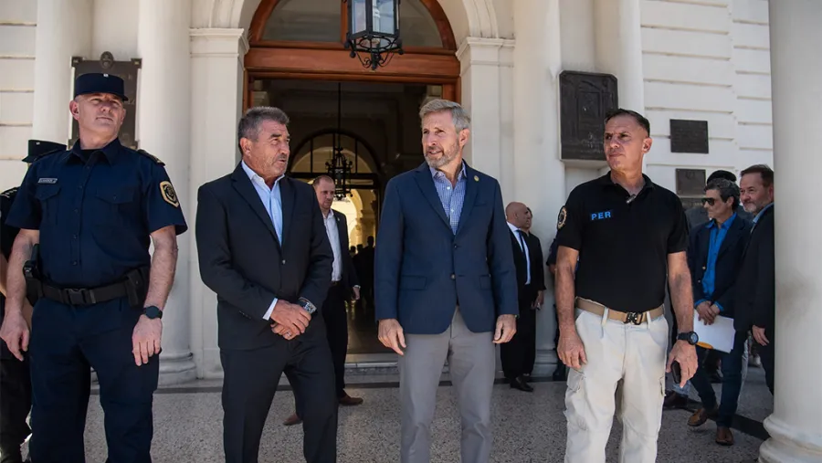 El ministro de Seguridad, Néstor Roncaglia, y el gobernador Rogelio Frigerio, frente a la Casa Gris, flanqueados por autoridades policiales.
