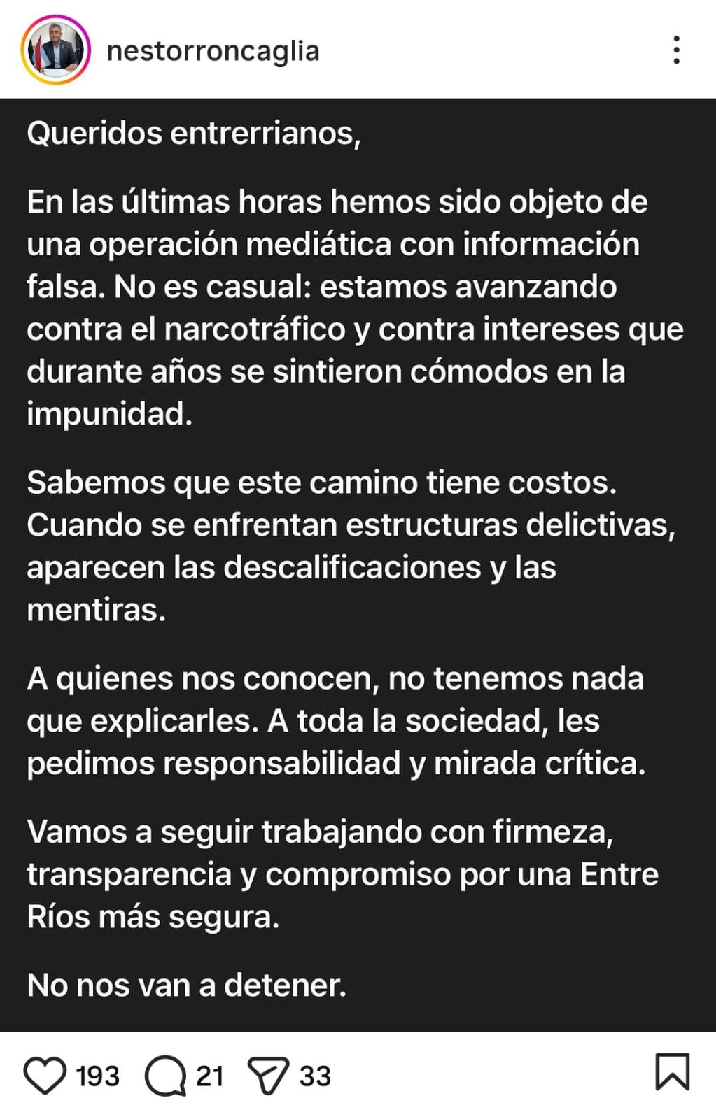 "Vamos a seguir trabajando con firmeza, transparencia y compromiso por una Entre Ríos más segura. No nos van a detener", cerró.