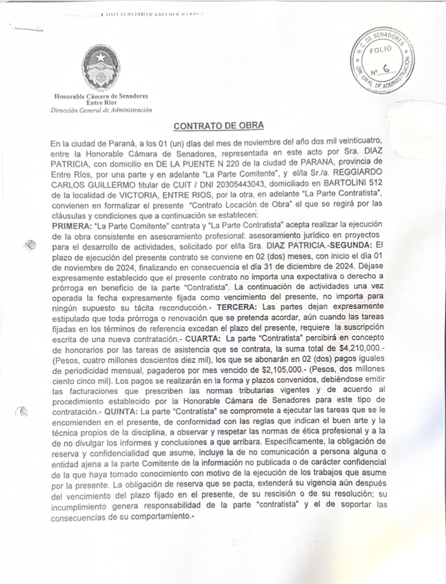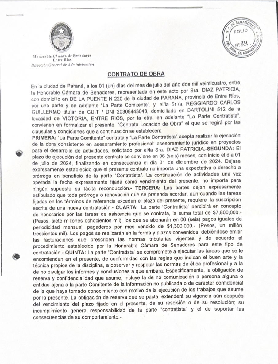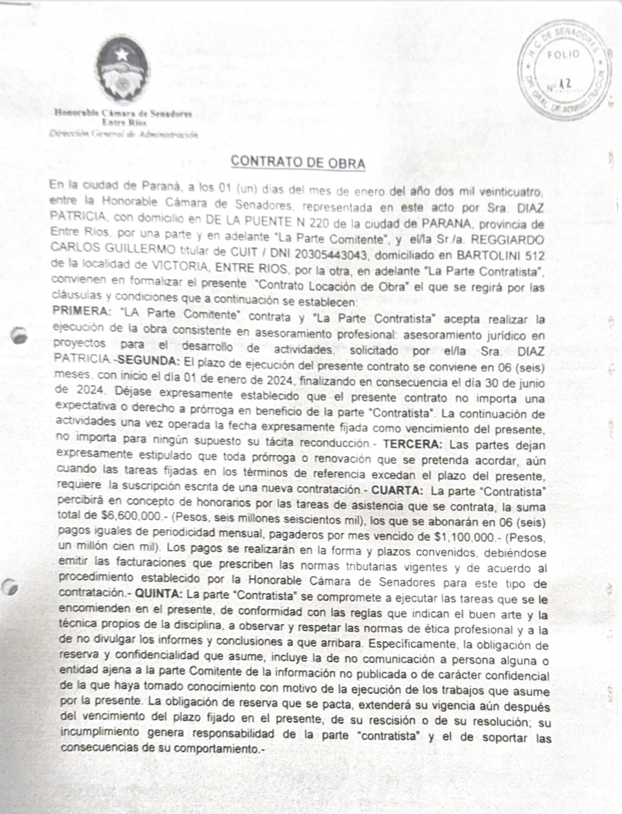Este miércoles, Reggiardo se refirió por primera vez a la vinculación laboral con el Senado en su página web La Caldera. Allí negó ser un "doble sueldo", aunque no negó haber percibido dinero como contraprestación del trabajo solicitado por la senadora Díaz: "Nunca he mantenido relación laboral alguna con el Senado de la Provincia de Entre Ríos. No existe designación, nombramiento ni vínculo jurídico que permita sostener semejante aseveración", afirmó. Y luego amplió: "Mi actividad profesional, como abogado, se ha limitado —como es propio del ejercicio liberal de la profesión— al asesoramiento técnico de diversos actores institucionales, sin que ello implique relación de dependencia ni percepción salarial por parte del Senado, percibiendo como cualquier prestador de servicios facturas, la cual ha sido un trabajo de asesoramiento jurídico y asesoramiento en proyectos".