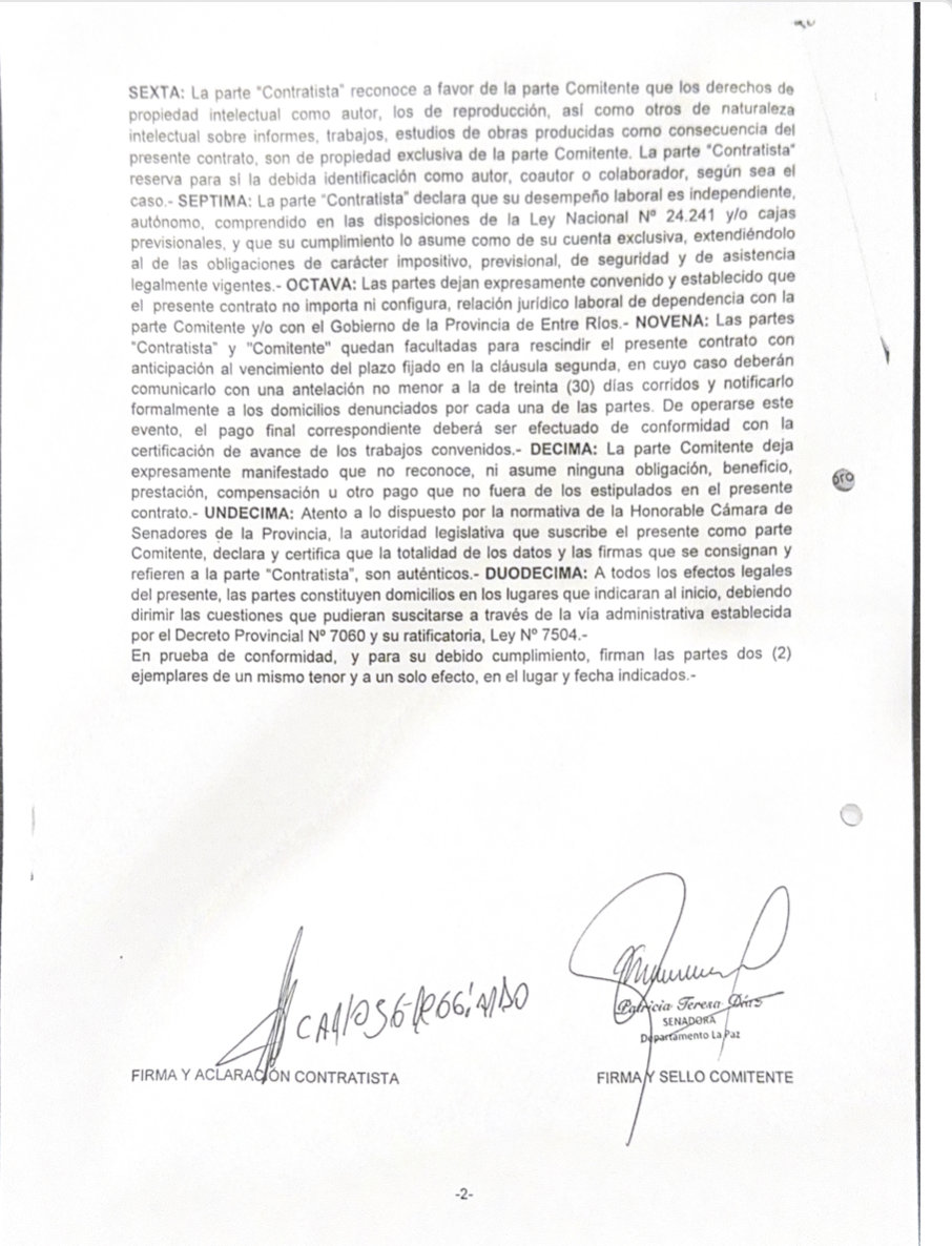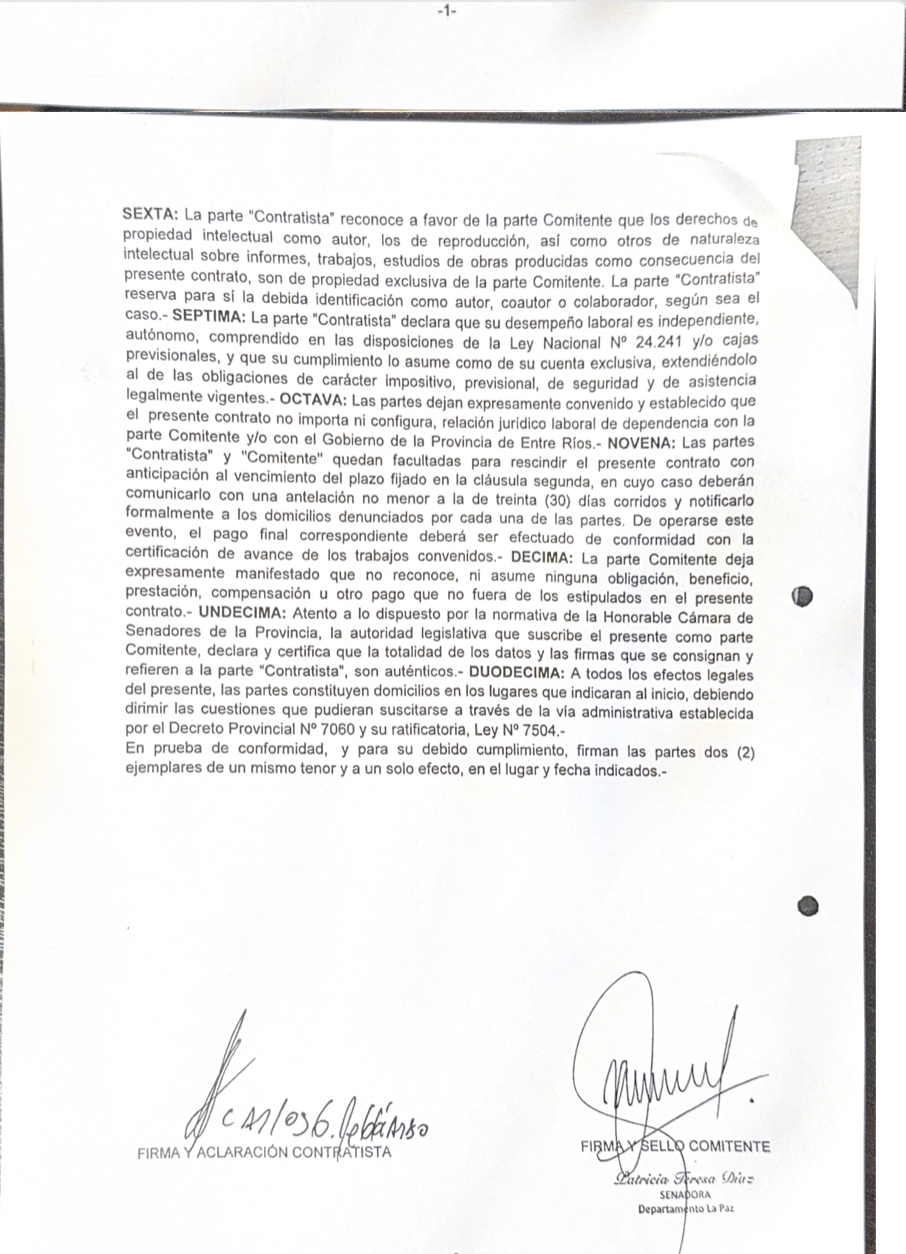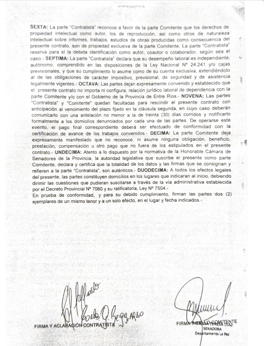 Este miércoles, Reggiardo se refirió por primera vez a la vinculación laboral con el Senado en su página web La Caldera. Allí negó ser un "doble sueldo", aunque no negó haber percibido dinero como contraprestación del trabajo solicitado por la senadora Díaz: "Nunca he mantenido relación laboral alguna con el Senado de la Provincia de Entre Ríos. No existe designación, nombramiento ni vínculo jurídico que permita sostener semejante aseveración", afirmó. Y luego amplió: "Mi actividad profesional, como abogado, se ha limitado —como es propio del ejercicio liberal de la profesión— al asesoramiento técnico de diversos actores institucionales, sin que ello implique relación de dependencia ni percepción salarial por parte del Senado, percibiendo como cualquier prestador de servicios facturas, la cual ha sido un trabajo de asesoramiento jurídico y asesoramiento en proyectos".