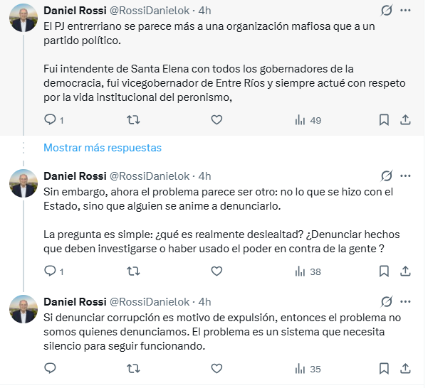 En un posteo en su cuenta en X, Rossi sostuvo: “El PJ entrerriano se parece más a una organización mafiosa que a un partido político. Fui intendente de Santa Elena con todos los gobernadores de la democracia, fui vicegobernador de Entre Ríos y siempre actué con respeto por la vida institucional del peronismo, aun cuando tuve diferencias profundas con muchas de sus conducciones. Por eso resulta llamativo que hoy se pretenda instalar que la mayor deslealtad partidaria es denunciar hechos de corrupción ante la Justicia”.