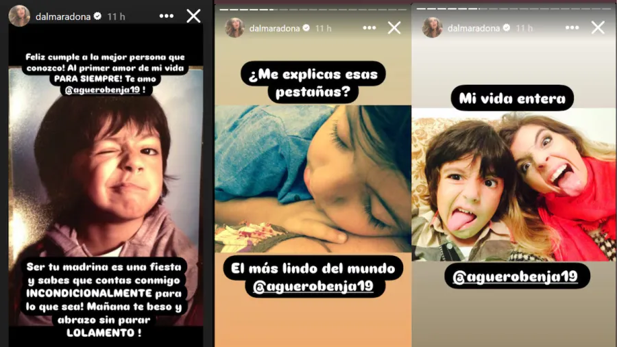 Cada foto que la hija de Maradona compartió es un portal a un momento especial. En una de ellas, Benjamín aparece de bebé, con ojos enormes y atentos, recostado sobre un fondo rojo. Es una imagen íntima, de esas que atesoran los comienzos de una vida. “Una de cuando tenía compu y eras mi protector de pantalla”, recuerda la actriz de Cebollitas, con esa nostalgia dulce que solo los recuerdos más preciados pueden provocar.