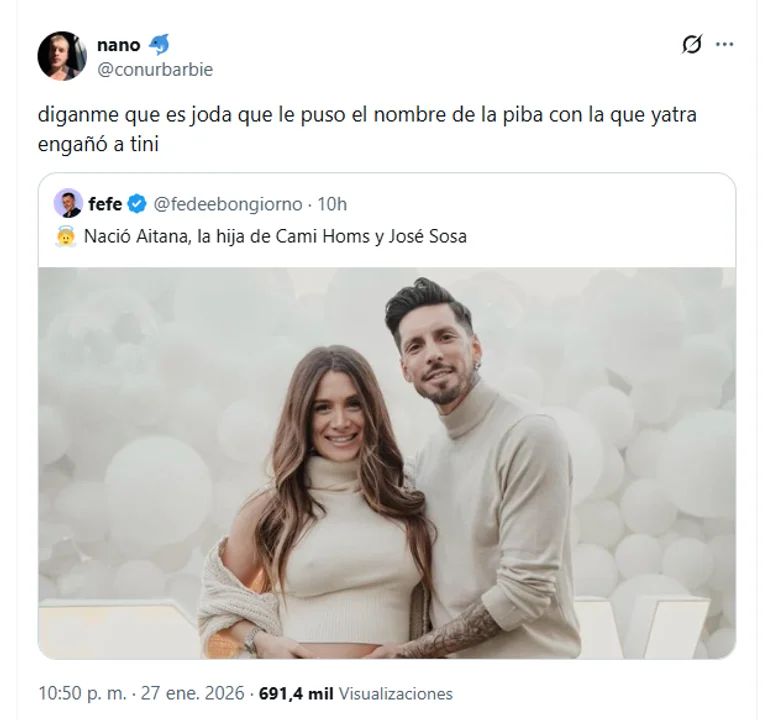 La polémica se encendió cuando un usuario de X (ex Twitter) destacó el trasfondo del nombre elegido. "Diganme que es joda que le puso el nombre de la piba con la que Yatra engañó a Tini", escribió la cuenta @conurbarbie, en un mensaje que alcanzó casi 700.000 visualizaciones en pocas horas.