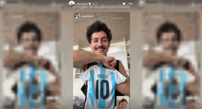 En la imagen se puede observar cómo el actor le está mostrando “el regalo que los pibes” le hicieron al pequeño Dante: una mini camiseta de fútbol de la Selección Argentina con el número 10 de Lionel Messi.