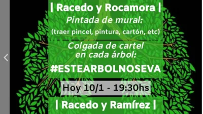 "Autoconvocadxs en Defensa del Espacio Verde y Arbolado de Bulevar Racedo", realizarán intervenciones artísticas bajo los lemas "No a la tala de árboles", "No al ensanche" y "Cuidémonos entre todos", en repudio a la obra de ensanche y doble vía de Bv. Racedo. Será a partir de las 18 en Bv. Racedo y Rocamora. Invitan a artistas a sumarse a la