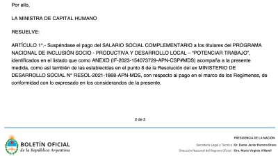 La ministra de Capital Humano, Sandra Pettovello, prepara una resolución para dar de baja a los 8538 empleados públicos de diez provincias que cobran, a la vez, el Potenciar Trabajo, una violación a la norma del mayor programa social que estaba bajo la órbita del ex Ministerio de Desarrollo Social.